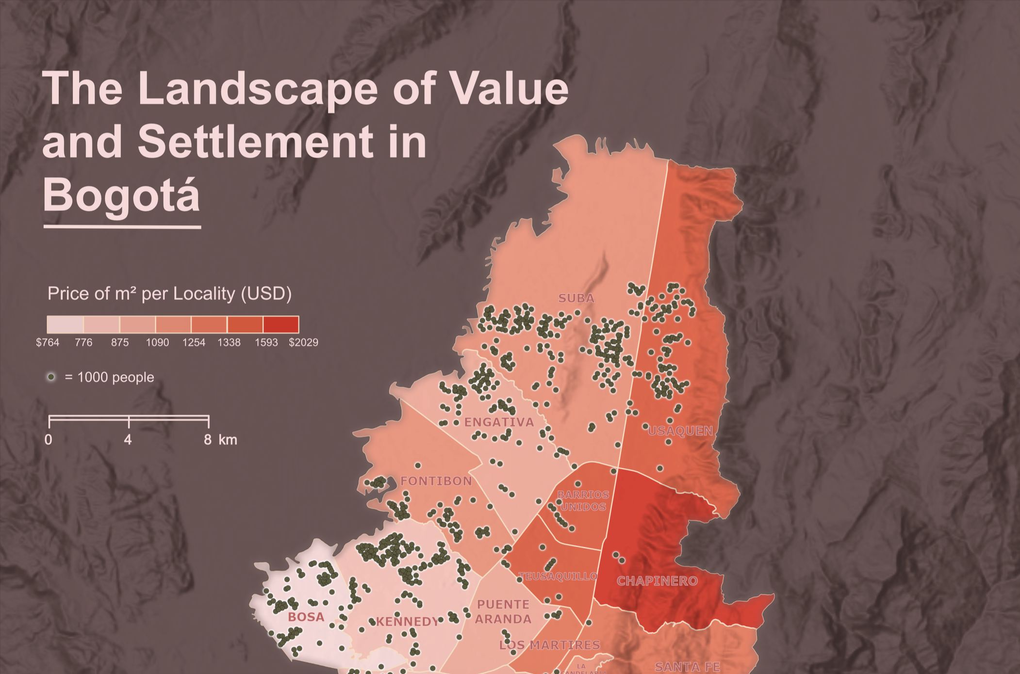 A spatial representation of household values in Bogotá in relation to residents’ settlement patterns. Housing prices are shown as relative values grouped by locality, while population distribution is expressed using a dot-density method, with each dot representing 1,000 inhabitants.