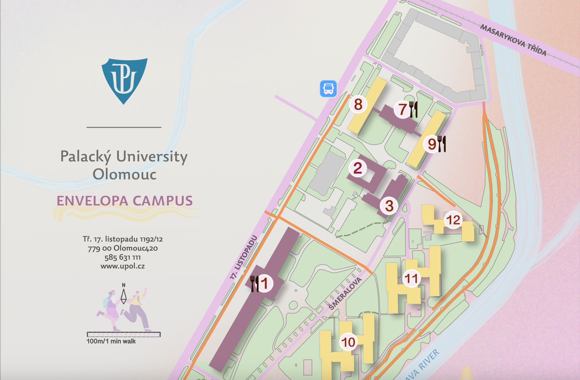 An appealing infographic of the Envelopa campus at Palacký University in Olomouc, highlighting key points of interest such as faculty buildings, dormitories, cafeterias, roads, and public transportation stops.