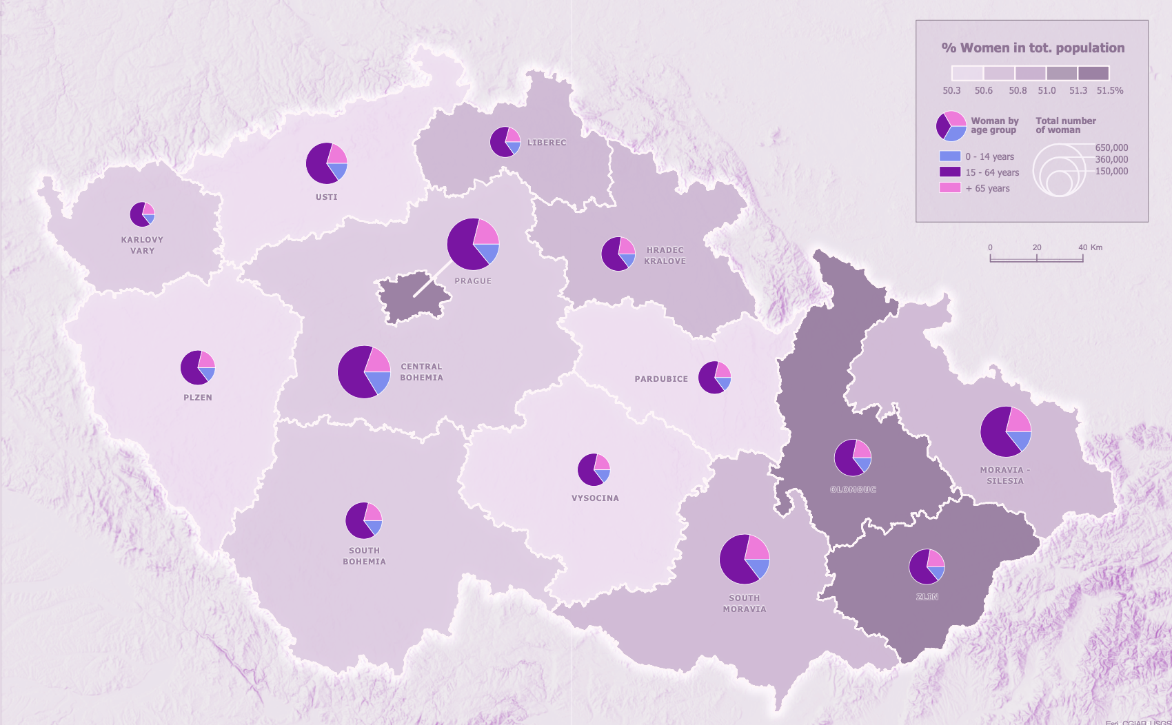 A map presenting the distribution of the female population by region in the Czech Republic, using three cartographic methodologies to illustrate different variables: the percentage of women in total population, the distribution of women by age group, and the total number of women.