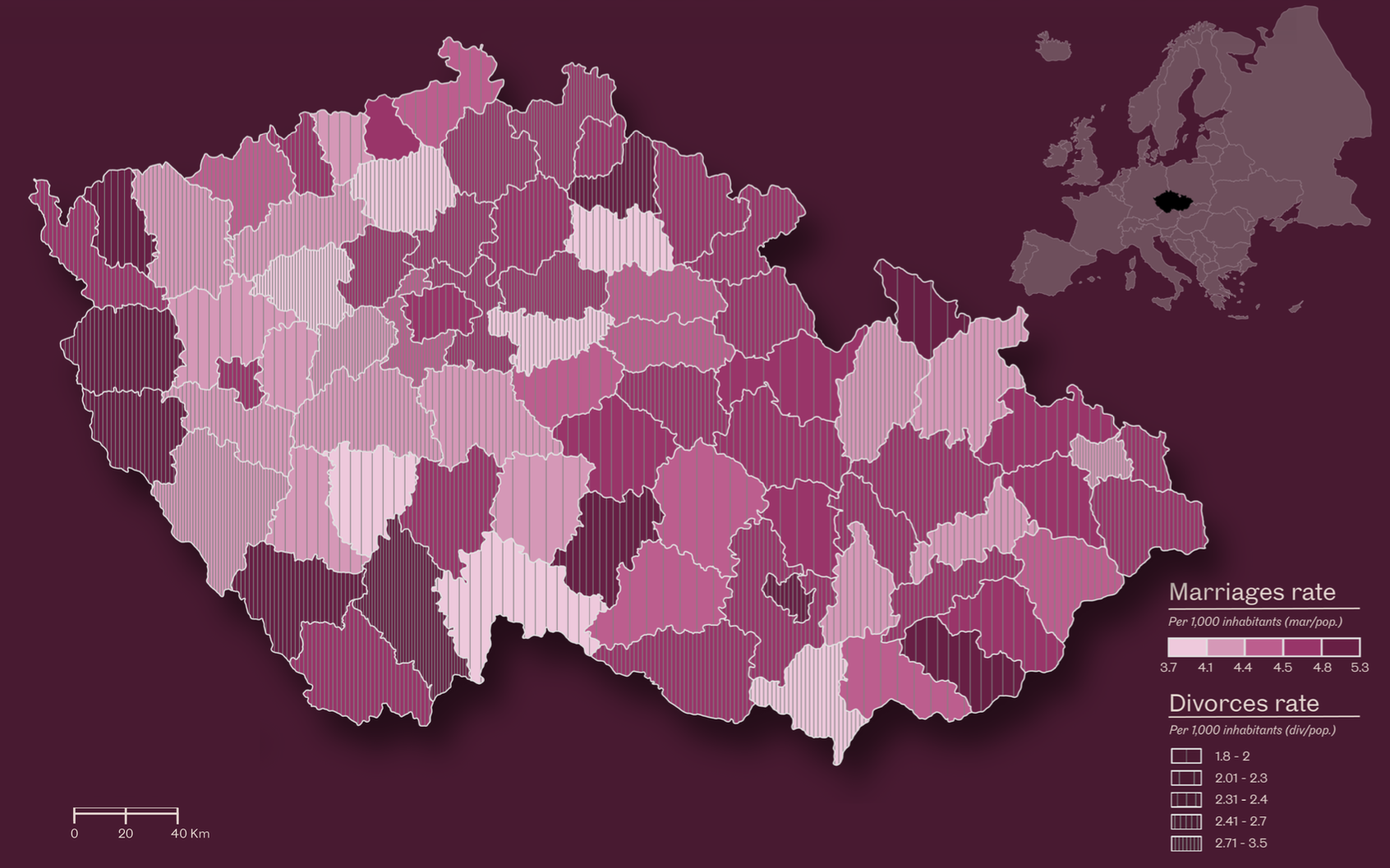 A choropleth map illustrating the distribution of marriages and divorces per 1,000 inhabitants in the Czech Republic. Marriages are represented using color gradients, while divorces are depicted through hatching techniques, allowing for clear visual comparison between the two indicators.