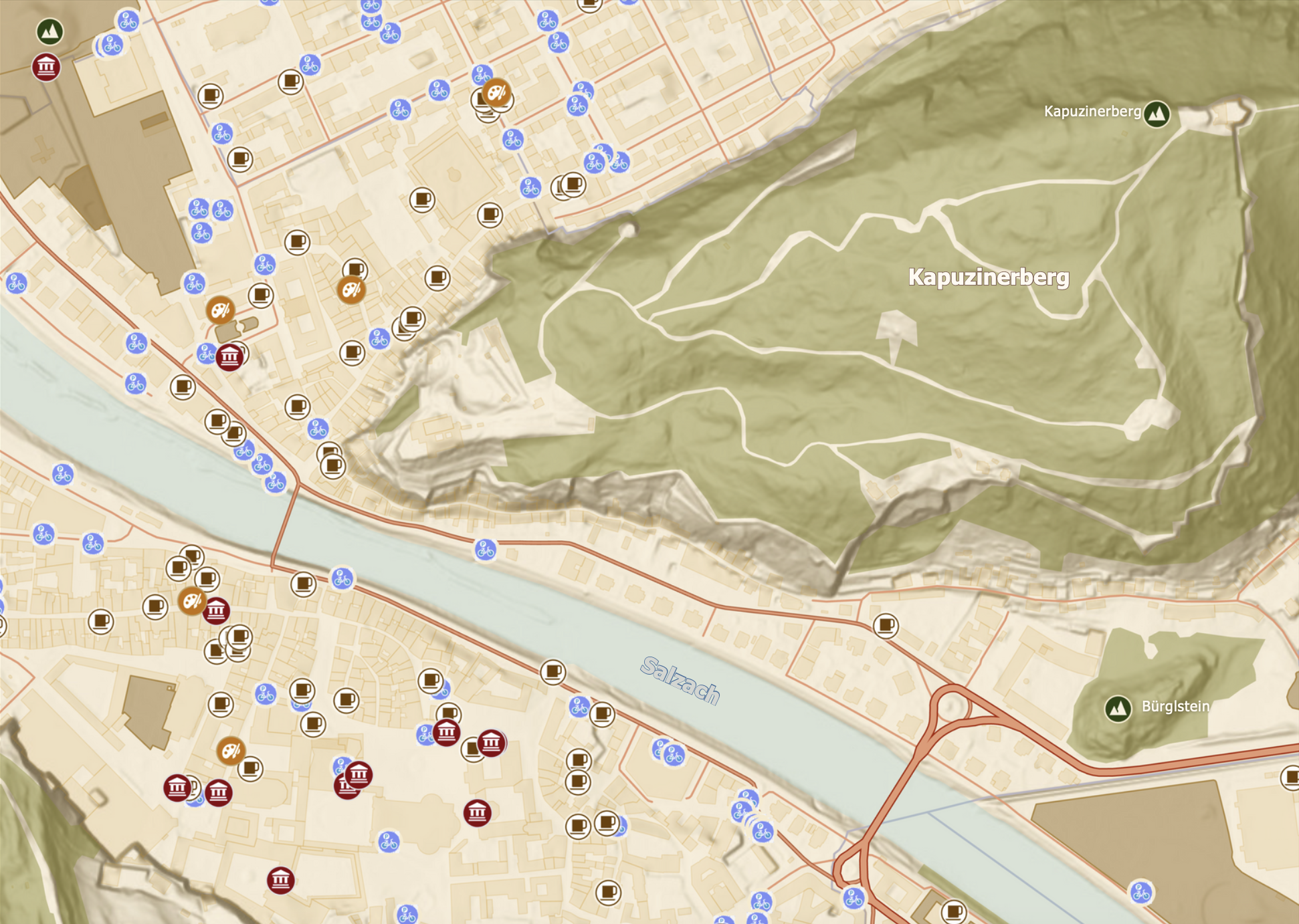 A realistic topographic map of Slazburg showcasing art galleries, museums, cafes, bike parkings, along with near by parks, green areas, buildings and natural fetures as the river Slazach. The maps also illustrates the main roads, organized into three distinct categories.