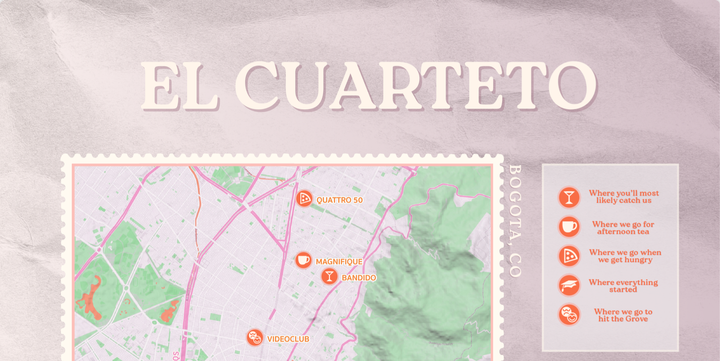This project is the result of an unconventional mapping initiative inspired by my closest friend circle (El Cuarteto) and some of our favorite POIs in our hometown. Geography is not only about spatially locating coordinates but also about the stories and energy they hold. We are geographically separated but projects like this help keep us connected.